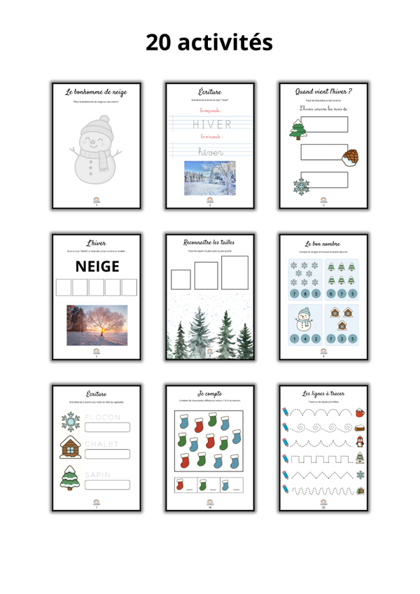 Ce livret coloré et pédagogique est parfait pour découvrir la saison hivernale tout en s’amusant. Il comprend 20 activités variées autour des éléments typiques de l’hiver : bonhommes de neige, arbre d'hiver, flocons… et bien plus encore !
