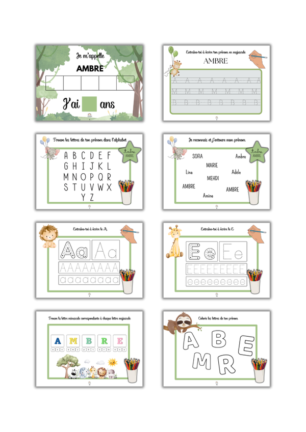 Ce livret ludique et éducatif est entièrement personnalisé avec le prénom de votre enfant (maximum 7 lettres), pour l’aider à reconnaître, tracer et maîtriser l’écriture de son propre prénom, tout en s’amusant !