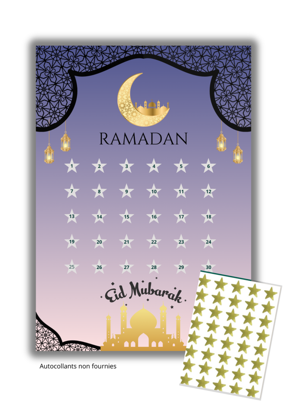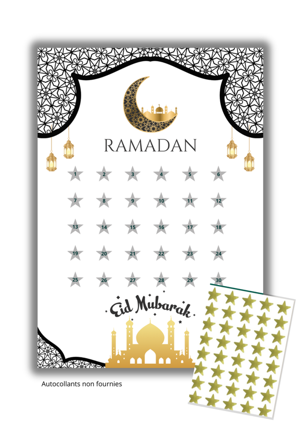 Ce calendrier à imprimer, entièrement gratuit et offert par My Lovely Kids, est vendu sans autocollants. Il permet aux enfants de suivre chaque jour du Ramadan de façon ludique et éducative. Pour marquer le passage des jours, l’enfant peut utiliser ses propres autocollants ou colorier les étoiles, rendant chaque étape du Ramadan interactive et personnalisée. Une belle manière de découvrir et d’approfondir leur foi tout en s’amusant !