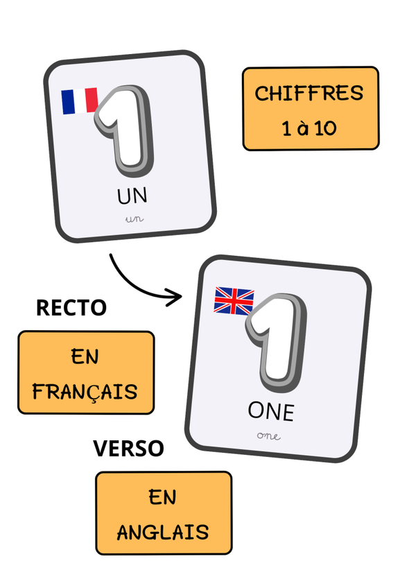 Verso : la traduction en anglais, pour apprendre les nombres dans les deux langues.