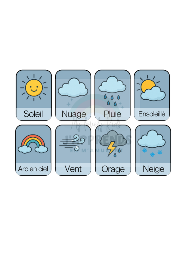 Chaque étiquette représente un phénomène météo avec une illustration claire et colorée.
