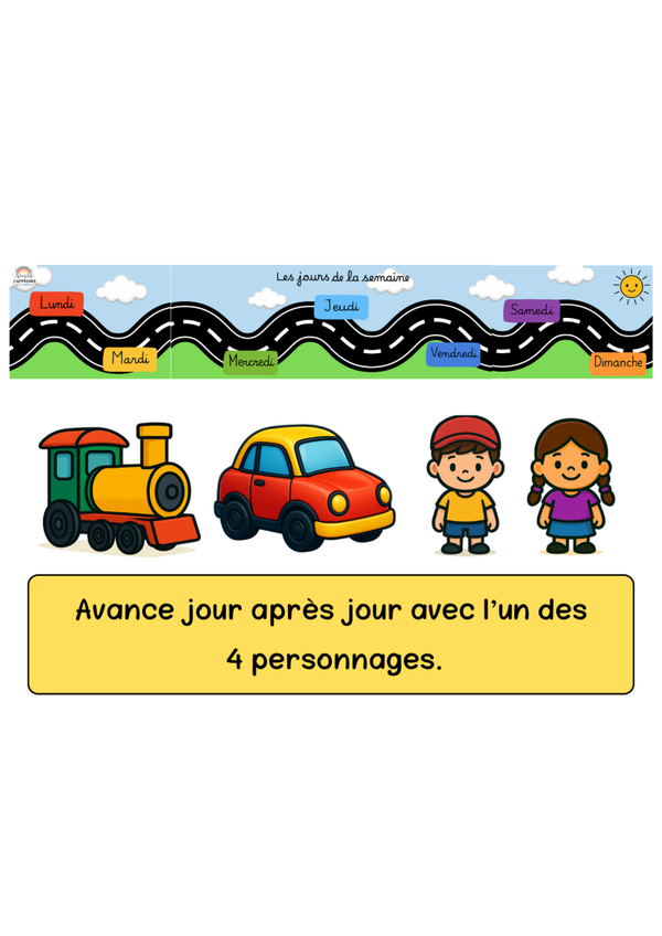 Cette frise éducative transforme l’apprentissage des jours en un petit jeu quotidien : l’enfant déplace son personnage au fil de la route et visualise facilement le jour dans lequel il se trouve.