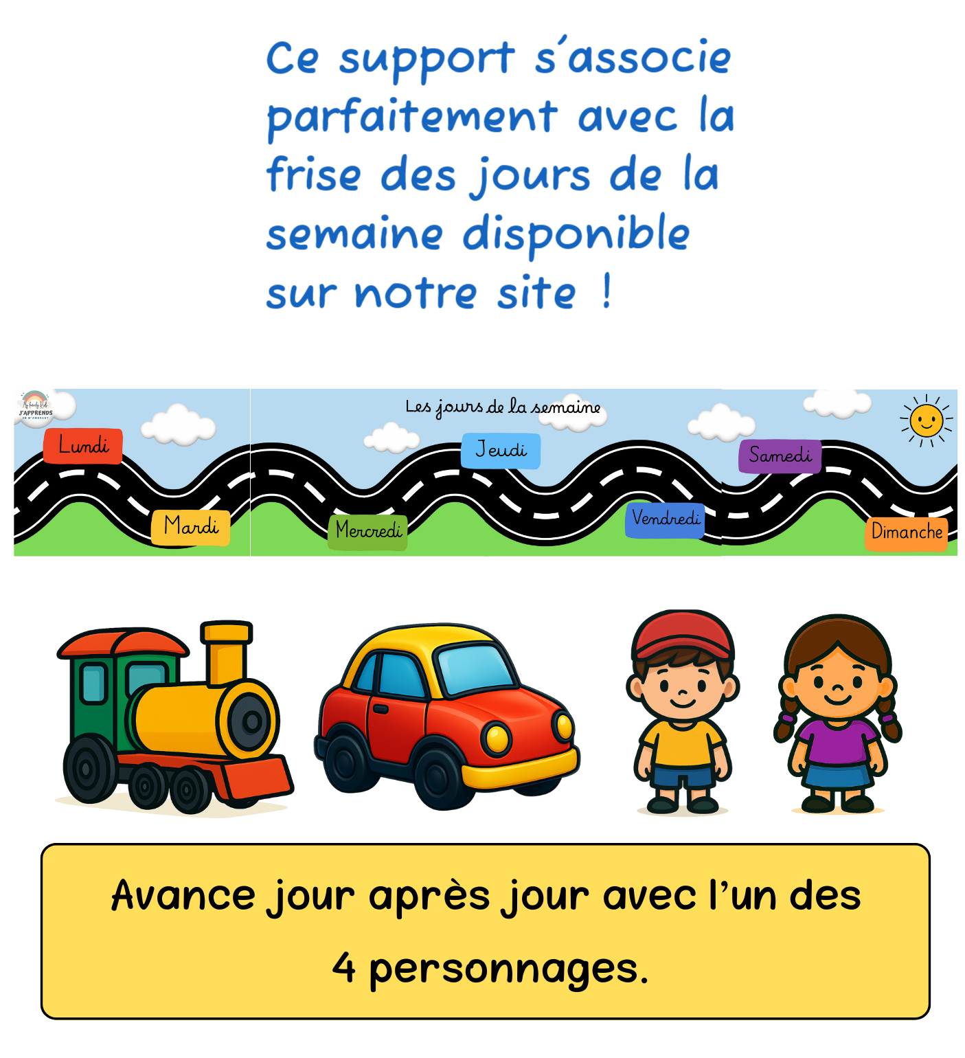 Ce support s’associe parfaitement avec la frise "La route des jours de la semaine", déjà disponible sur notre site. Ensemble, ils forment un duo idéal pour accompagner les apprentissages du temps au quotidien.