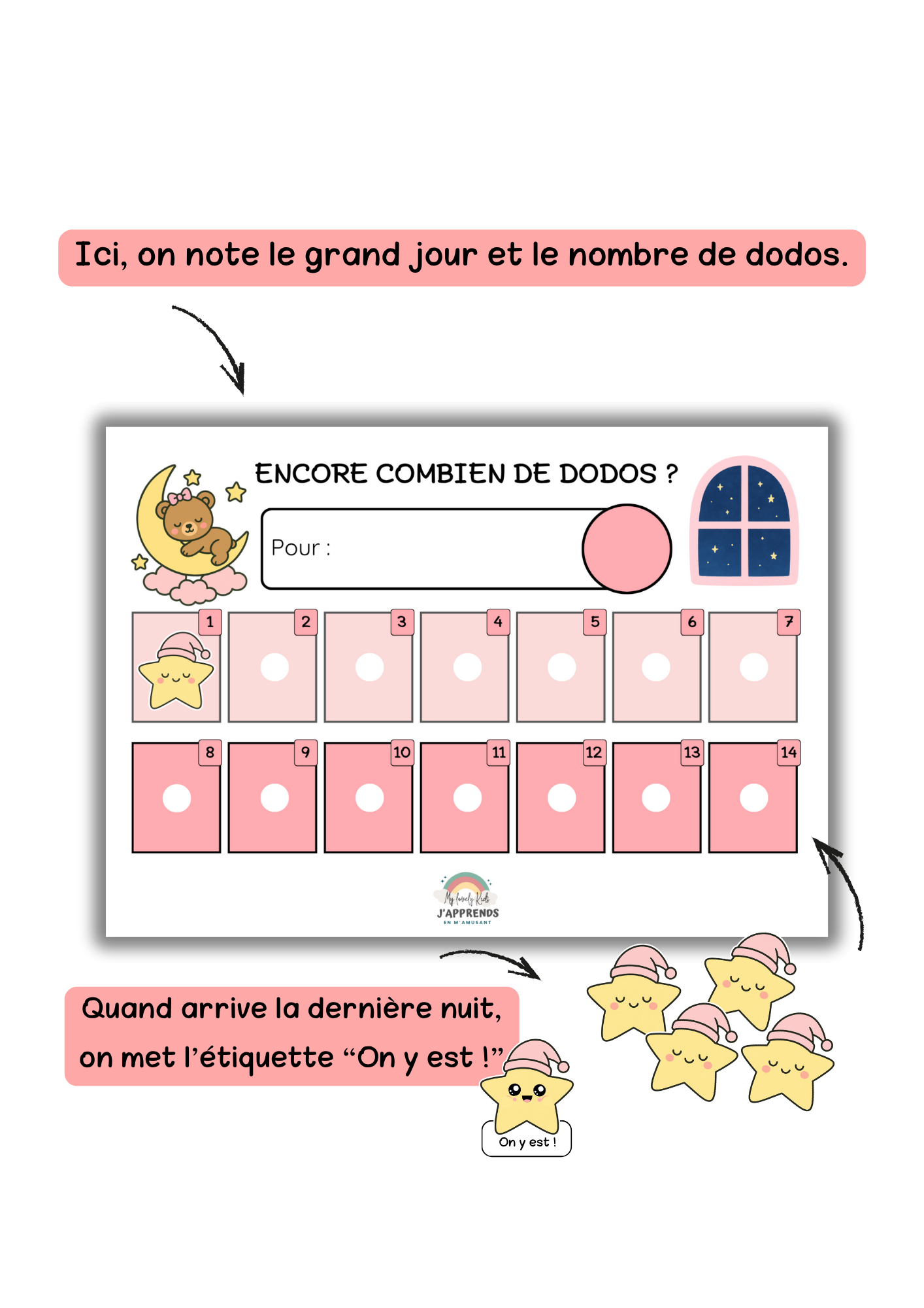 Dans le cercle prévu à cet effet, le parent indique le nombre de dodos restants avant le grand jour (jusqu’à 14 nuitées).