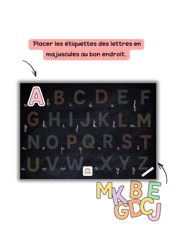 Ce support éducatif pour enfant représente un joli tableau d’école, orné des lettres de l’alphabet en écriture cursive, sur lequel l’enfant doit placer les étiquettes des lettres en majuscules au bon endroit.