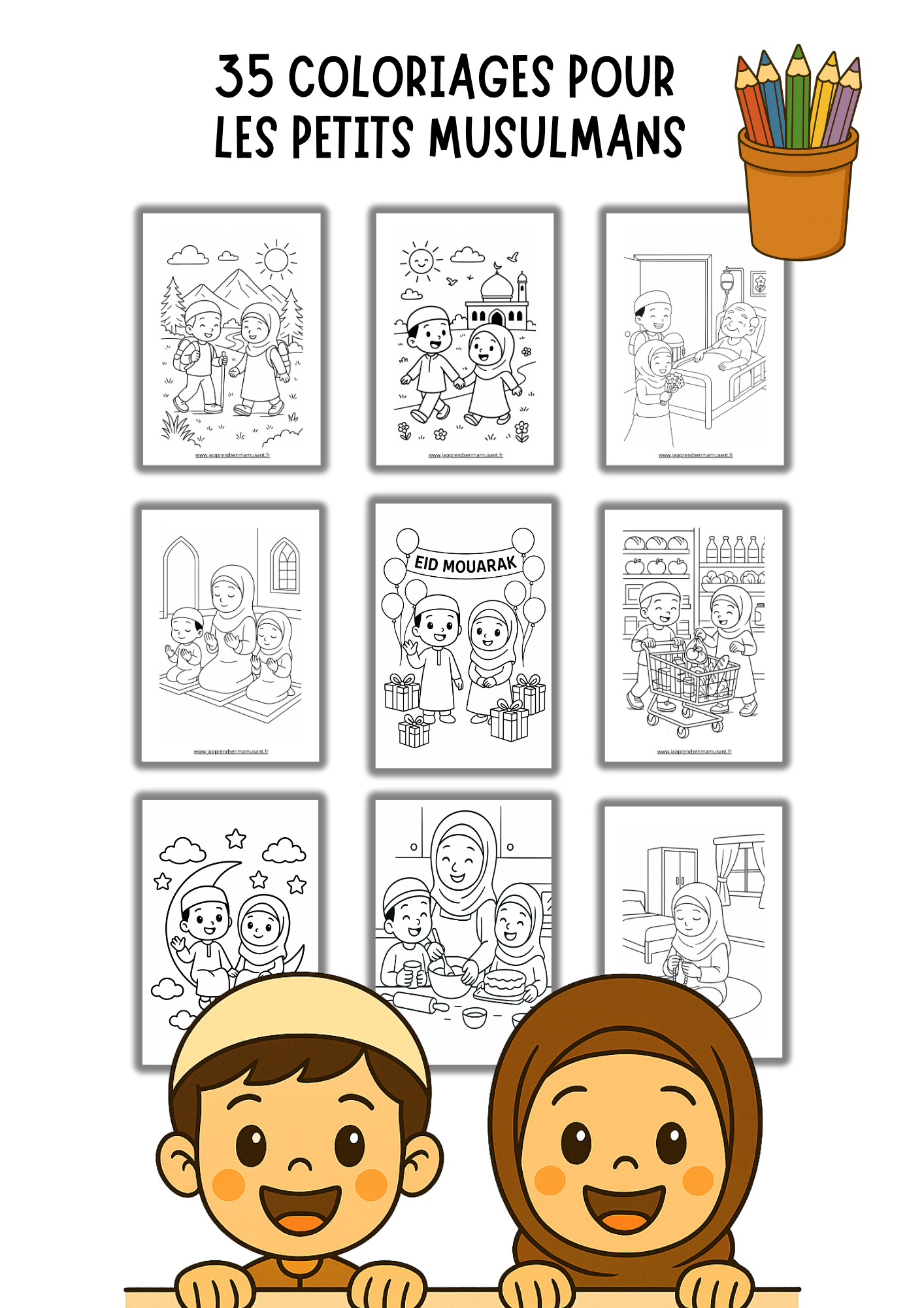 Ce pack de 35 coloriages islamiques aide les petits musulmans à apprendre les bonnes actions, les valeurs islamiques et les habitudes positives, tout en s’amusant.